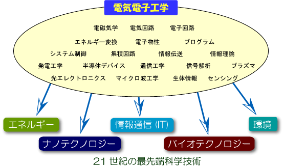 ユビキタス社会を支えるフォトエレクトロニクスや情報通信技術、電気エネルギーを作り出す発電技術、工業生産を支えるロボットの制御技術のほか、地球温暖化を防止するための太陽光発電やプラズマ応用環境対策技術、ナノテクノロジー、バイオテクノロジーなど、21世紀における人類の持続的繁栄のために必要な「人と地球に優しい革新的な未来技術の創出」には、電気電子工学の知識と技術を中核とした最先端科学技術の発展が不可欠です。